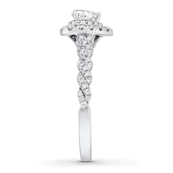 A gorgeous symbol of your love, this sparkling bridal set from features an engagement ring with a romantic heart-shaped diamond haloed by glimmering round diamonds. The band and matching wedding ring are adorned with twists of round diamonds, bringing the total weight of the set to 7/8 carat. The ring is styled in 14K white gold.
