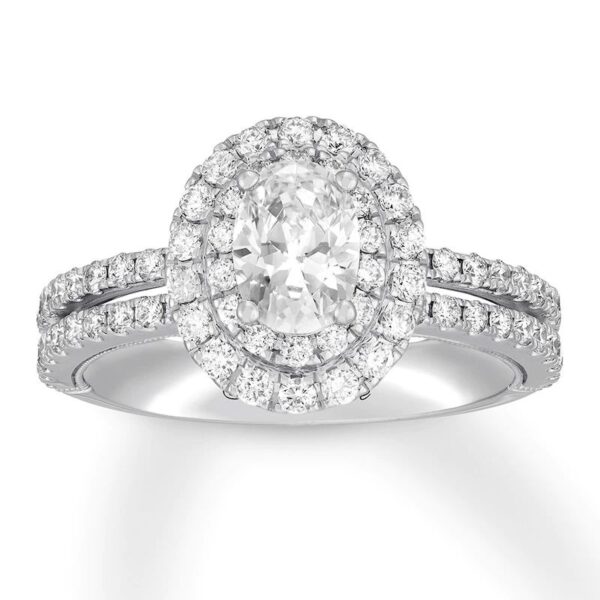 Engagement ring embraces the modern beauty of the halo design. The brilliant 1-carat oval-shaped diamond center reflects passion for vintage designs, while round diamonds add sparkle to the split-shank band. The diamonds total 1 3/4 carats in weight.