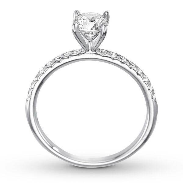 This timeless engagement ring is graced with a sparkling 5/8-carat round diamond center. More diamonds glisten along the band to complement, bringing the total diamond weight to 3/4 carat. The ring is fashioned in 14K white gold.