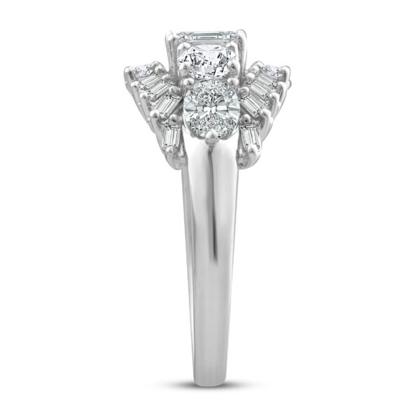 This mesmerizing diamond ring collection features five distinctively-shaped diamonds, symbolic of everything she means to you. Each diamond shape has a different meaning, from integrity and wisdom, to confidence, totality, and elegance. This stunning 10K white gold ring features a pear-shaped, princess-cut, emerald-cut, round-cut and oval-cut diamond set across the center. Sparkling baguette-cut diamonds flank outward above and below, with two brilliant round-cut diamonds finishing the iconic look. The ring has a total diamond weight of 2 carats.